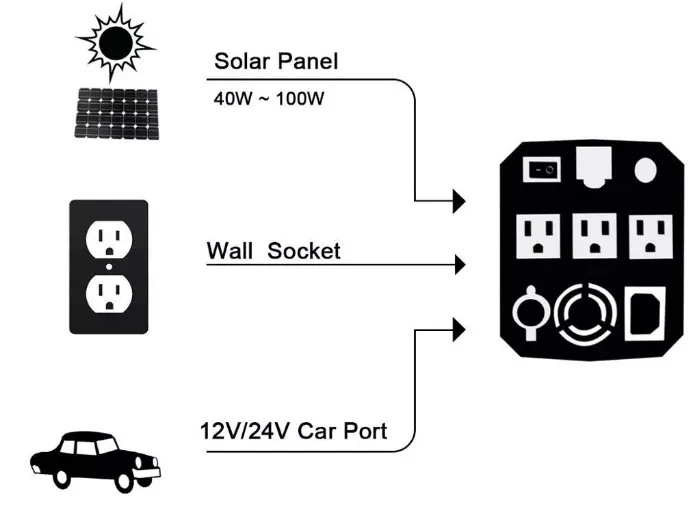 Com saída AC / DC 12 v / 220 v / 5 v, é adequado para diferentes dispositivos como telefones celulares, tablets, laptops, pequenas impressoras, tipos de lâmpadas e lanternas, aquecedores de aquários pequenos, equipamentos fotográficos,
