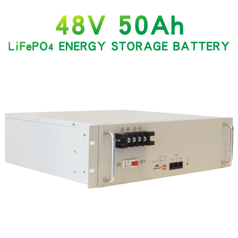Este sistema de bateria 48V 50Ah LFP possui BMS embutido e caixa de aço inoxidável pintada em preto ou branco.