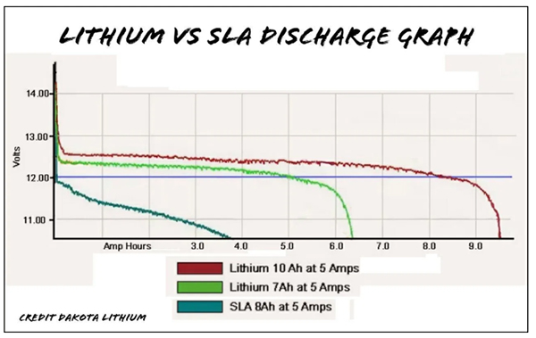 - Baterias pequenas de chumbo-ácido seladas apresentam queda extrema de tensão sob carga pesada. Eles nunca foram projetados para aplicações de alta amperagem. Na verdade, pequenas baterias seladas de chumbo-ácido foram projetadas para receber uma pequena carga por um longo período de tempo. Aplicando os típicos 15 a 20 amperes de um rádio moderno de 100 watts, experimentamos uma queda de tensão significativa. Um pacote de íon de lítio ou fosfato de ferro-lítio adequadamente construído não mostra a mesma queda de tensão que uma bateria de ácido de chumbo. Na verdade, sob carga, a tensão é relativamente baixa durante a descarga de íons de lítio e pacotes de fosfato de ferro e lítio.