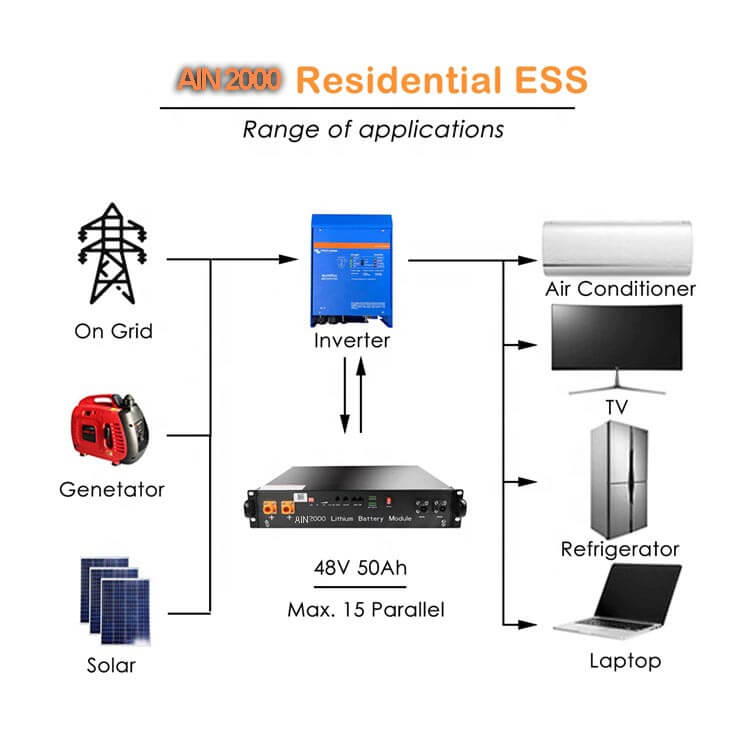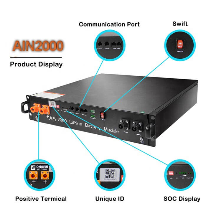 1. A bateria do sistema solar AIN2000 48v é desenvolvida com célula LFP de alto desempenho 3.2V 50Ah e estrutura padrão EV para garantir segurança e excelente vida útil.