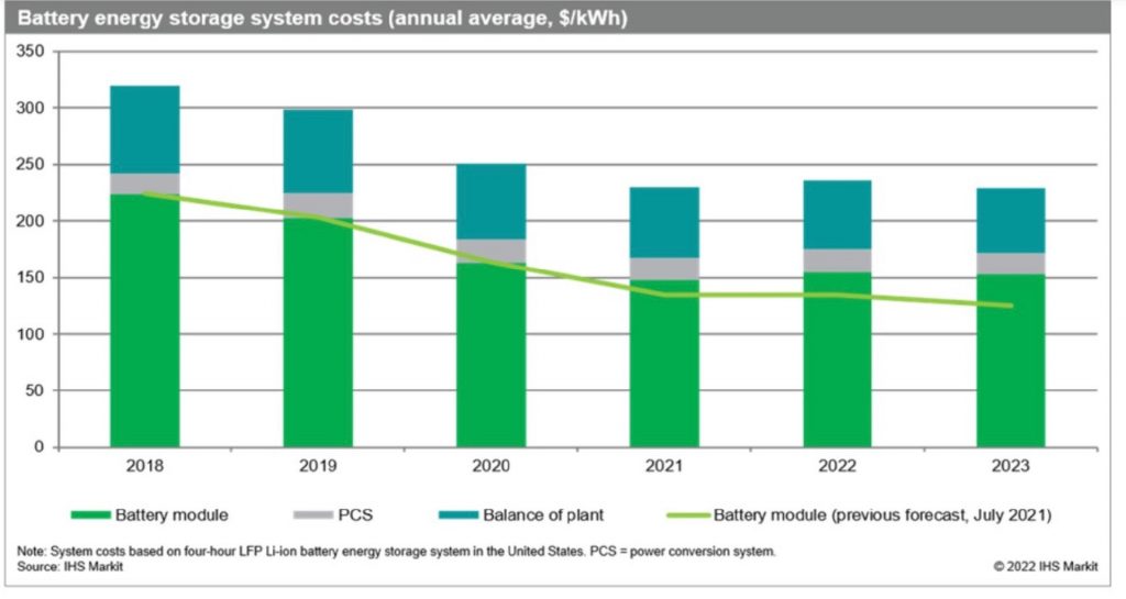 Em um white paper recente, a IHS Markit previu que o aumento dos preços das matérias-primas colocaria mais quedas nos preços das baterias EV até 2024. Essa análise previu que os preços médios das baterias EV em 2022 serão 5% mais altos do que em 2021, principalmente devido ao aumento do auto- demanda da indústria por baterias de fosfato de ferro e lítio (LFP).